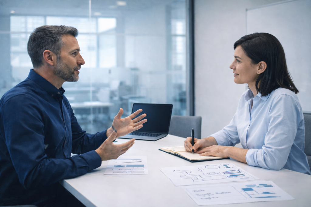 Zu Beginn klären mit den betroffenen Personen Ziele und Rahmenbedingungen in einem kompakten Einstiegsgespräch. Danach vereinbaren wir konkrete Formate, wie regelmäßige Führungskräfte-Sessions, Coaching-Termine oder Workshop-Reihen, mit klaren Zeiträumen und Zielvorstellungen.
